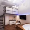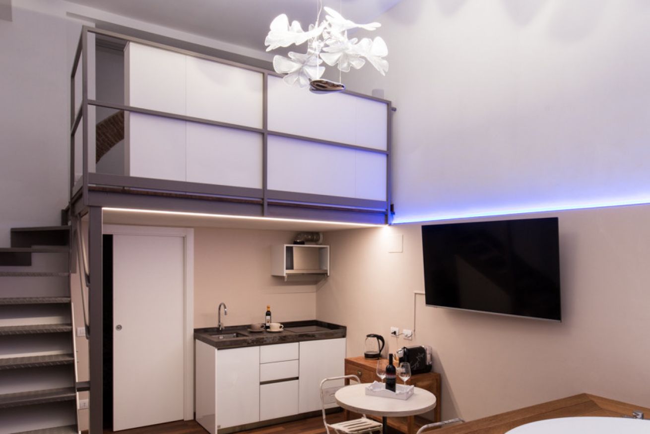 E’ un ambiente unico di 25 mq con letto su soppalco e vasca idromassaggio, angolo cottura, bagno con doccia. Ideale per le coppie e per chi viaggia solo (anche per lavoro) e non vuole rinunciare al relax.
